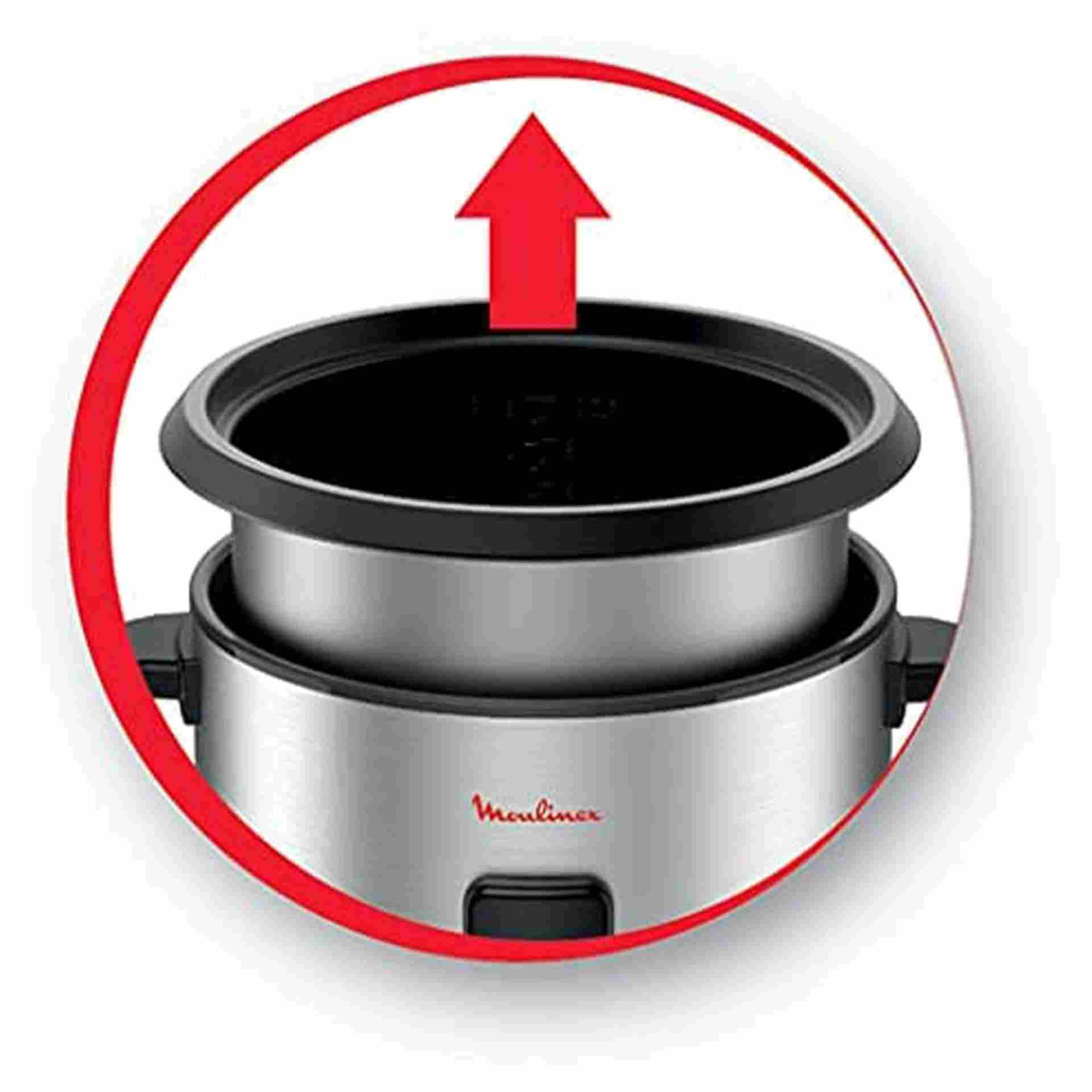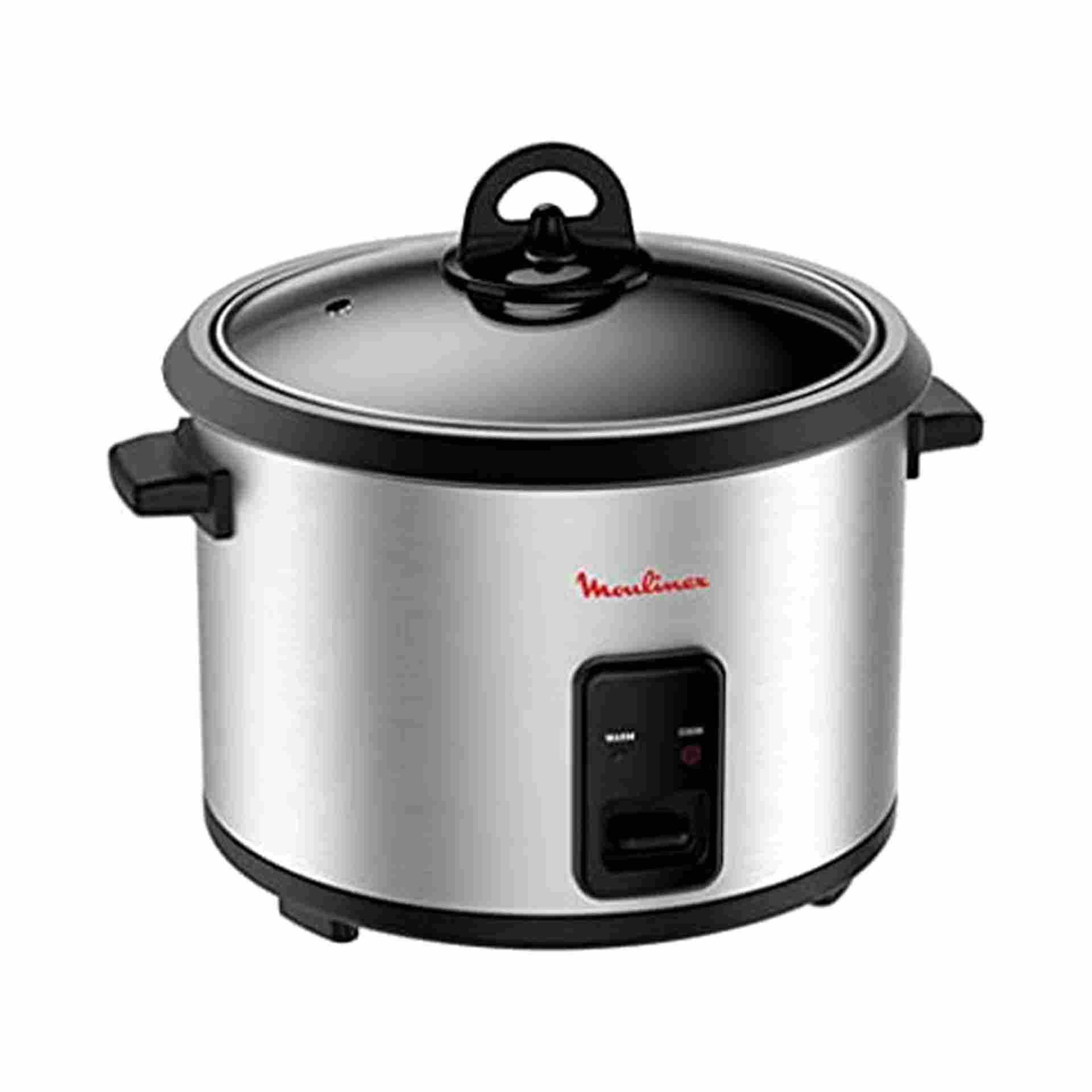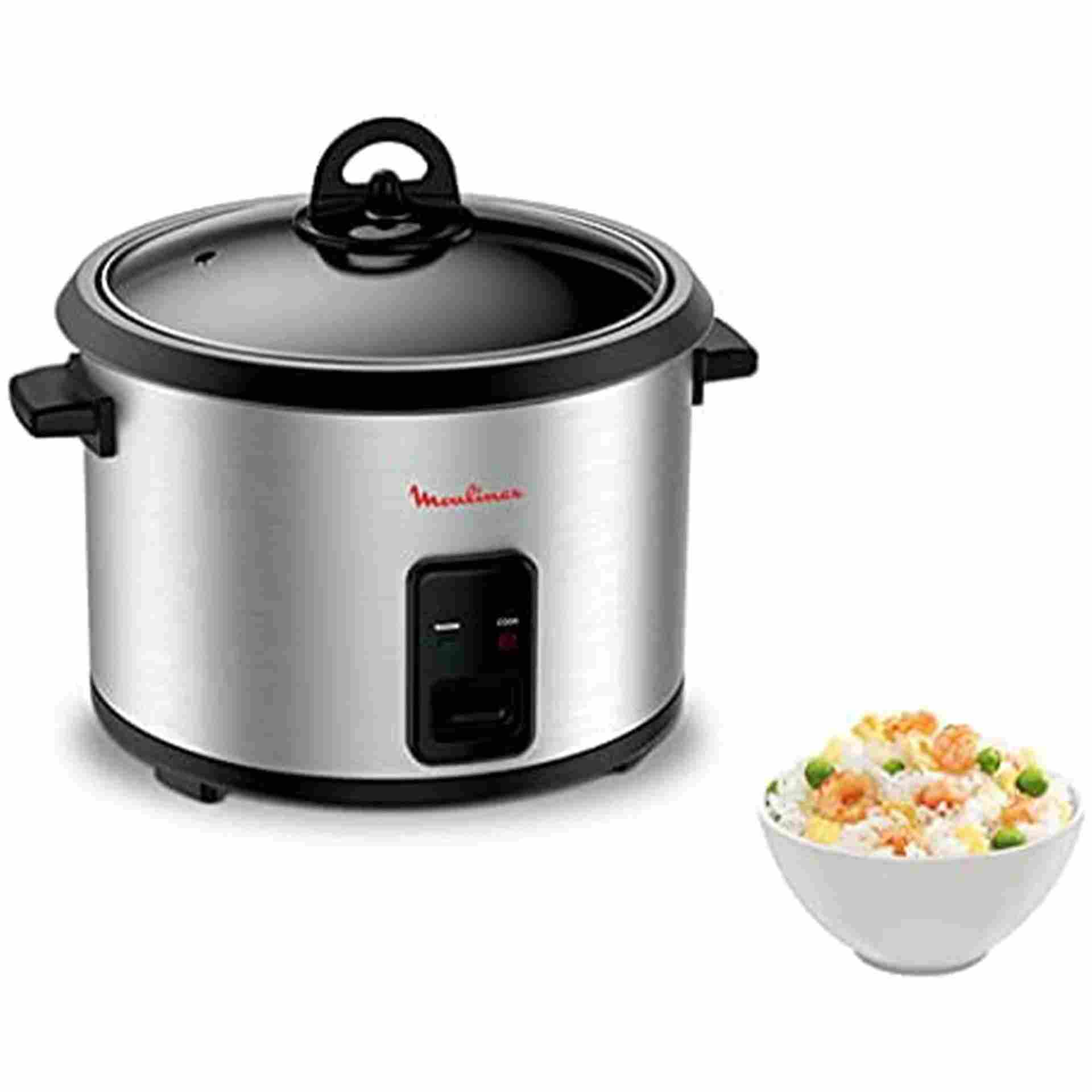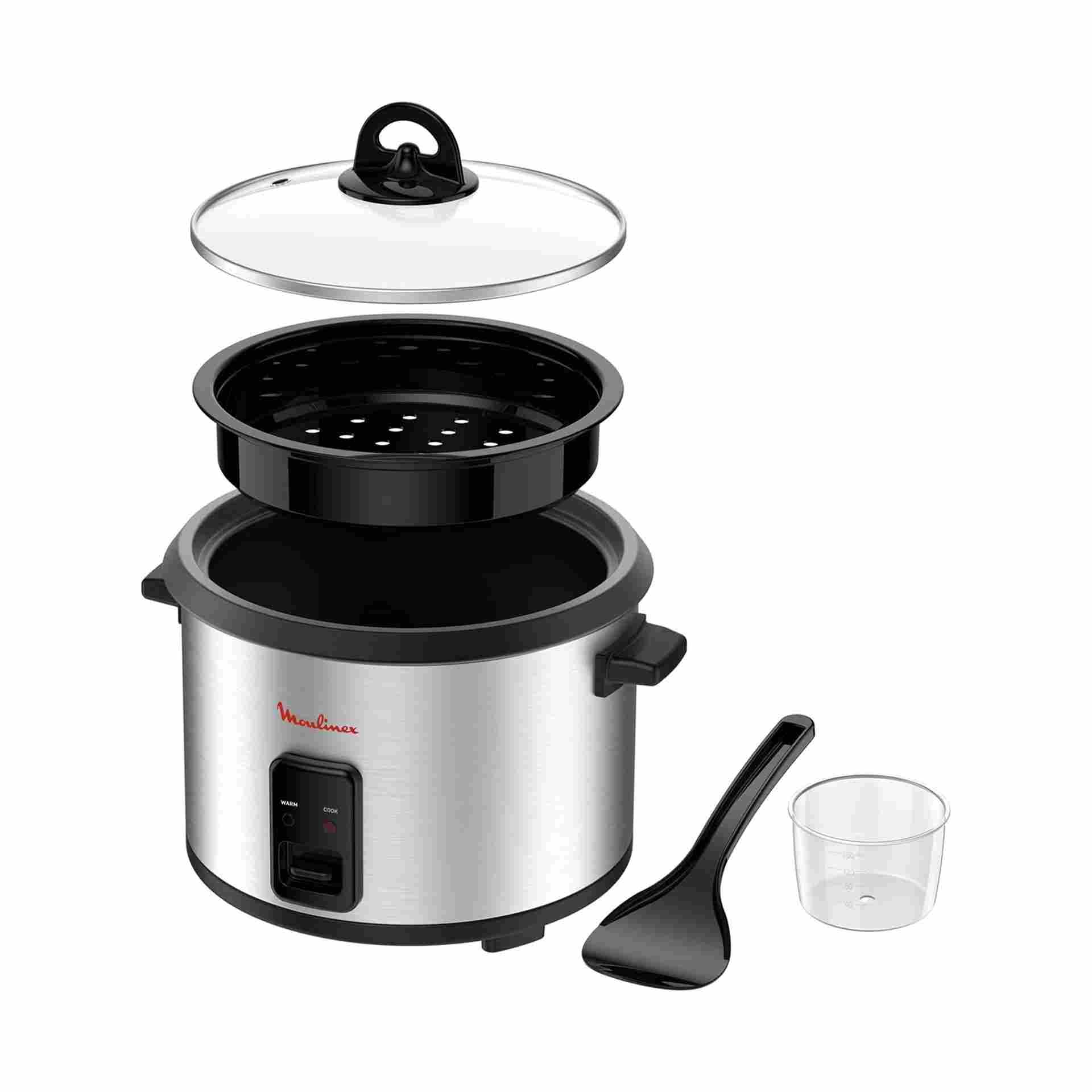 Moulinex MK123D27 Rice Cooker with 700W power and 1.8L capacity for up to 10 cups. Features a non-stick removable bowl and glass lid—easy to clean and perfect for fluffy rice every time.